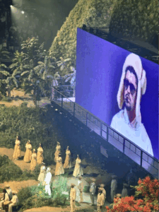 One thing about this tour, it told a story. The lights came on, and two people emerged, one looking for their drum and the other their camera. In a way, representing their roots and their memories or connections. Interacting with the crowd helped find their items hidden amongst the greenery, then more dancers in all-white almost Traditional jibaro clothing.