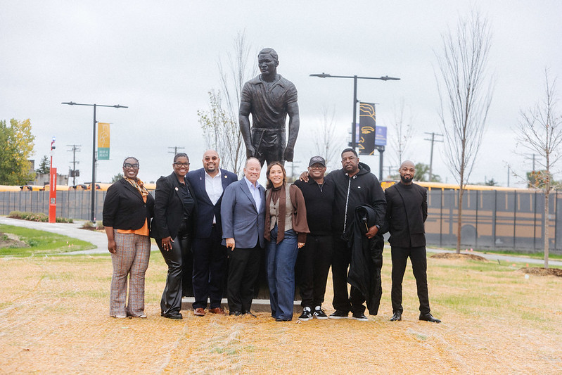 Mayor Mike Duggan joined with community partners and residents recently to cut the ribbon on a beautiful section of the Joe Louis Greenway at Grand River near Oakman Boulevard and to unveil a new bronze statue of the boxing legend that will adorn this section of the 27-mile greenway named in his honor.