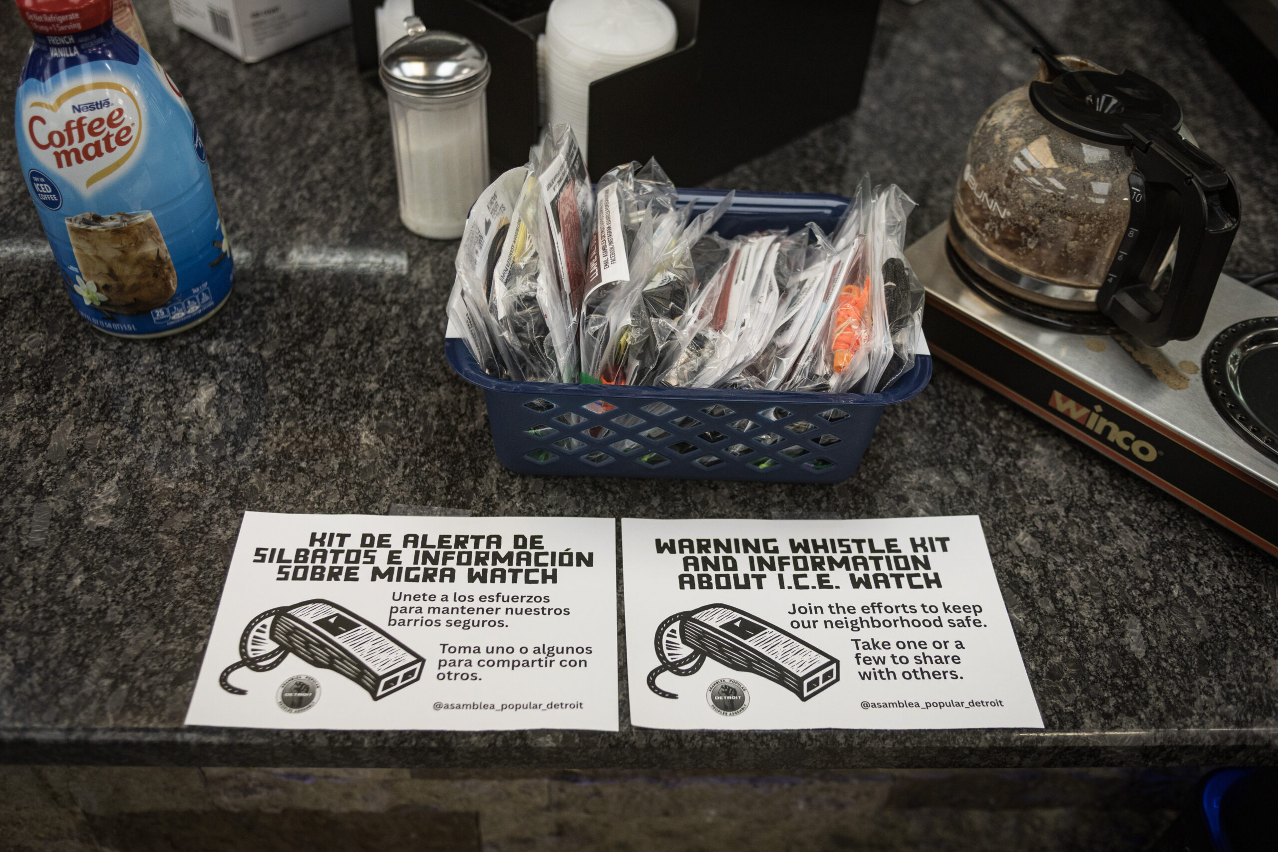 “Es para la migra”, fue la frase que Evan, miembro de Asamblea Popular Detroit usó para entrar en confianza. Evan se había acercado a un grupo de obreros que compraban comida mexicana para desayunar en una estación de servicio en la avenida Livernois, en Southwest Detroit. La docena de obreros no hablaba inglés. Evan, con un español masticado, intentaba ofrecerles y explicarles lo que tenía en la mano: un silbato. Uno a uno, los obreros, aunque vacilantes, comenzaron a tomar los paquetes de silbatos que horas antes Evan, junto a otros voluntarios, armaron por centenares. Adoptado desde noviembre, lo de hoy fue una distribución rutinaria de silbatos con instrucciones en bodegas, restaurantes y gasolineras de la zona.