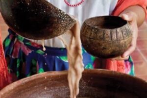 The tejuino, due to the material it is made of, represents to a certain extent the Wixárika family and the cooperation that exists in different areas among all its members: the man, the women, girls and boys who sow, take care of the sacred plant of corn and harvest it. Likewise, in preparation, the opposite or rather complementary poles, masculine-feminine, are always present and in constant relationship; the man who carries firewood and the woman who prepares the drink; Tejuino comes from dry corn (male), but which has germinated (female) and has been ground to be cooked in pots with water (female) slowly over the fire (male). It is served in jícaras or other containers (feminine) that represent the world, the totality of the human settlements.