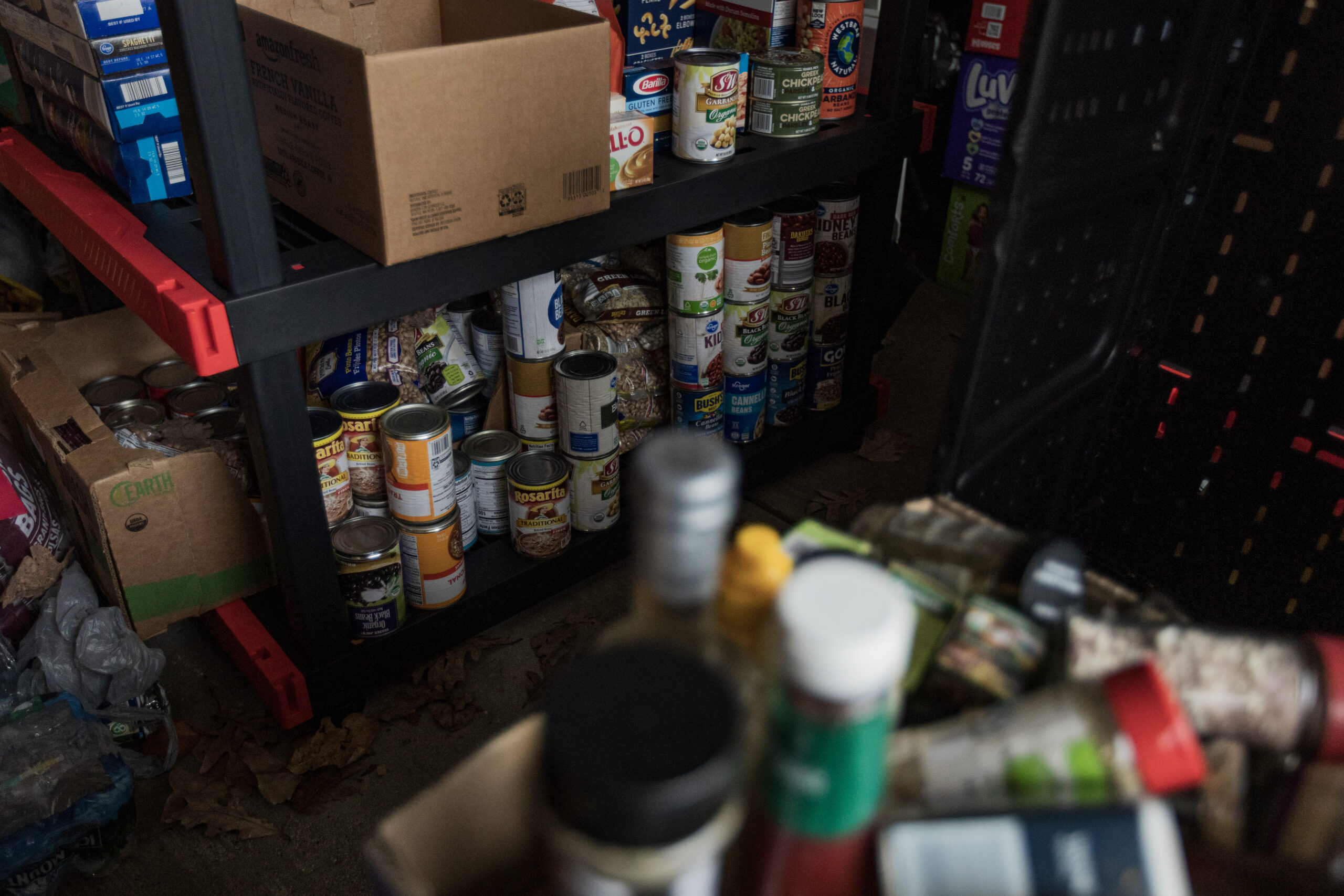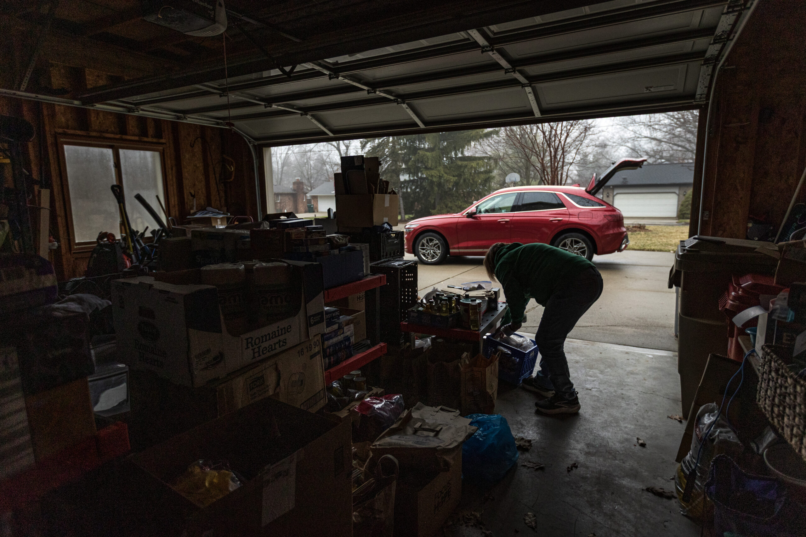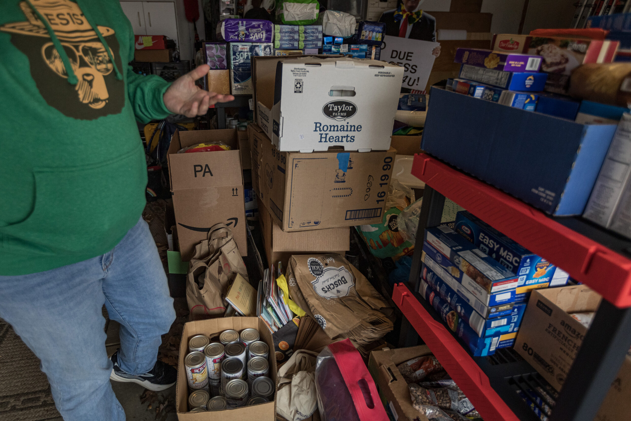 Antes de salir, Helterhoff echa un último vistazo a su cochera, más de la mitad ocupada por donaciones de alimentos y productos de higiene que puede almacenar. El carro está listo, pero hoy no usa el suyo; es rentado.