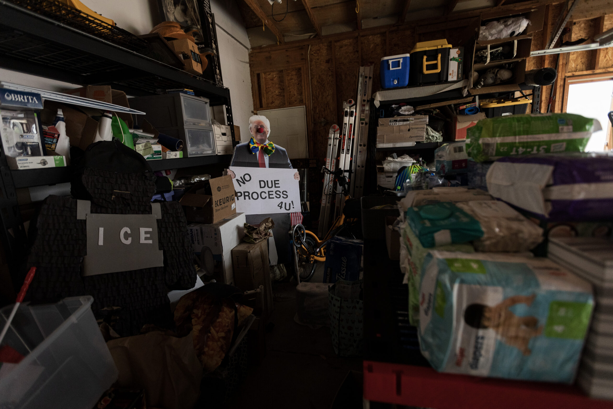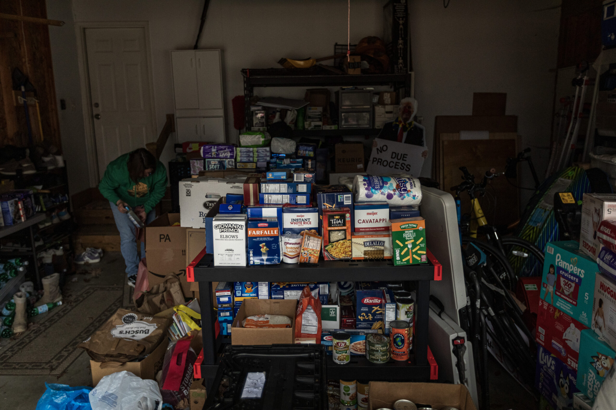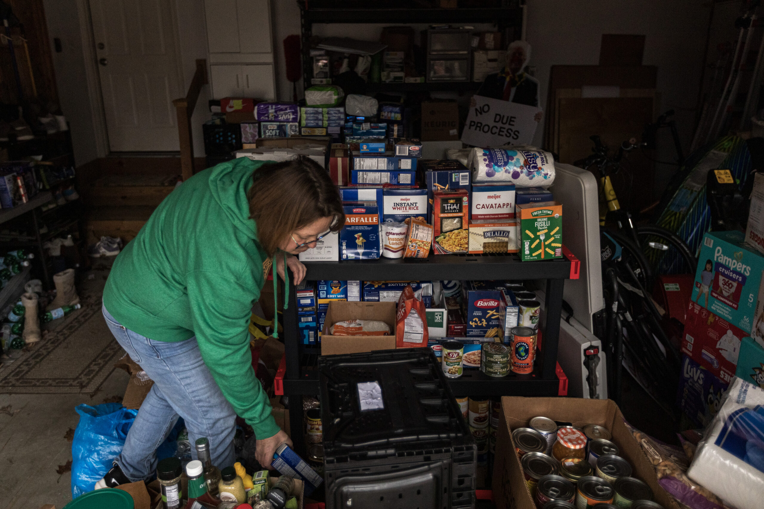 Before leaving, Helterhoff takes one last look at her garage—more than half of which is occupied by donations of food and hygiene products that she can store. The car is ready, but today, she isn’t using hers; it’s rented. “To throw off the ICE a little,” she says. “A lot of it is so no one is keeping track of me. Because I don’t want any of us to guide ICE to someone’s home accidentally.” Her first stop will be a local food pantry to round out the list of necessities with fresh items such as vegetables, fruits, and bread.