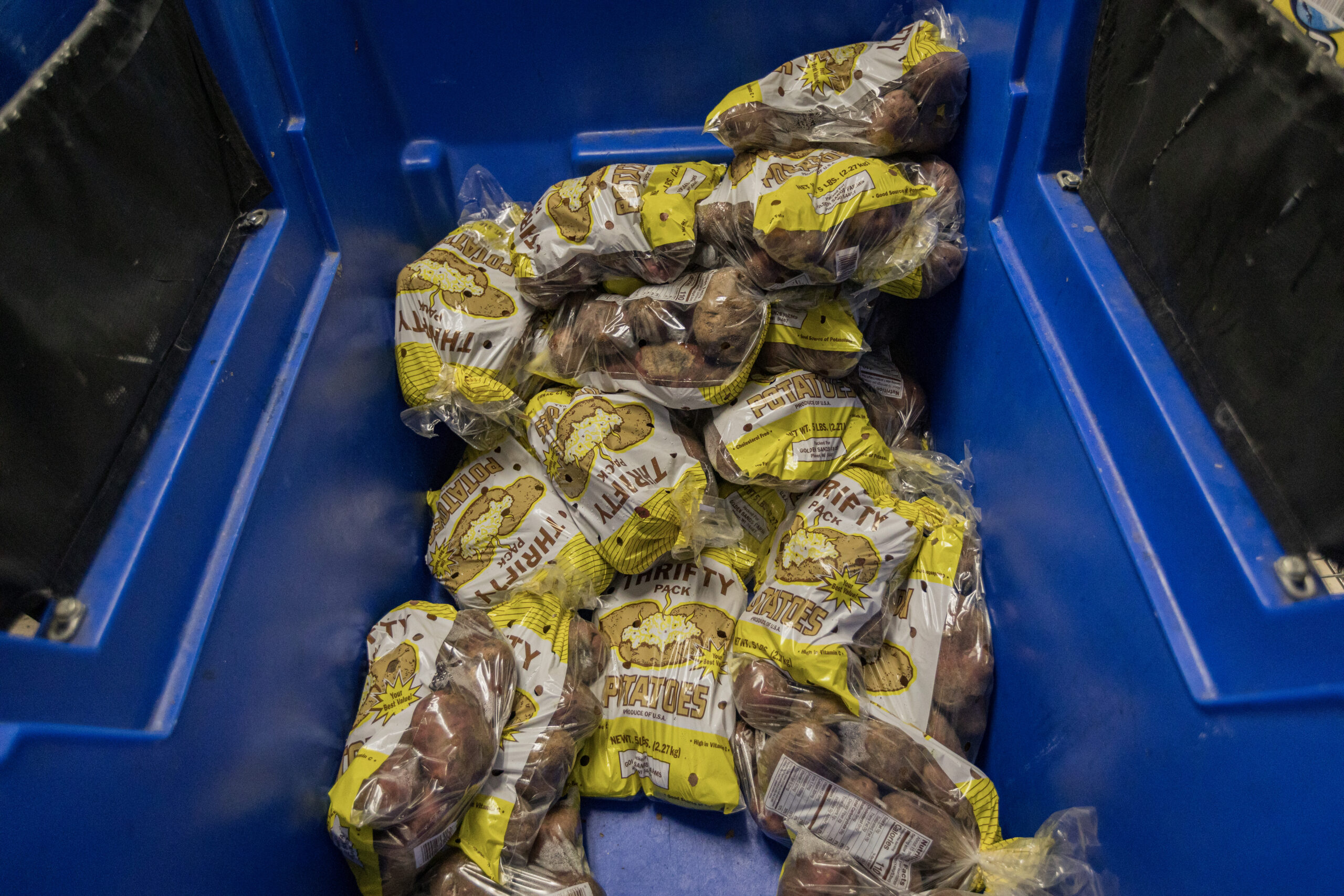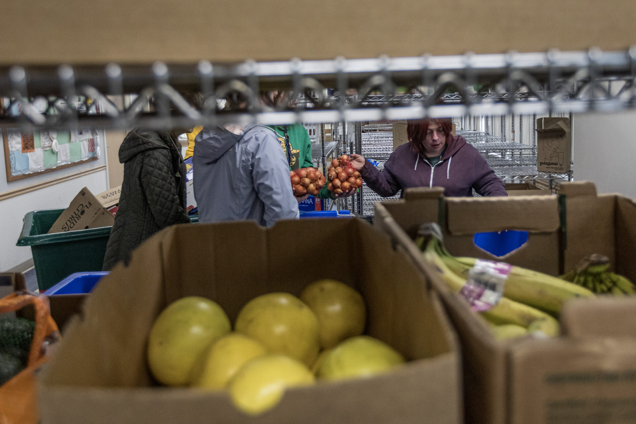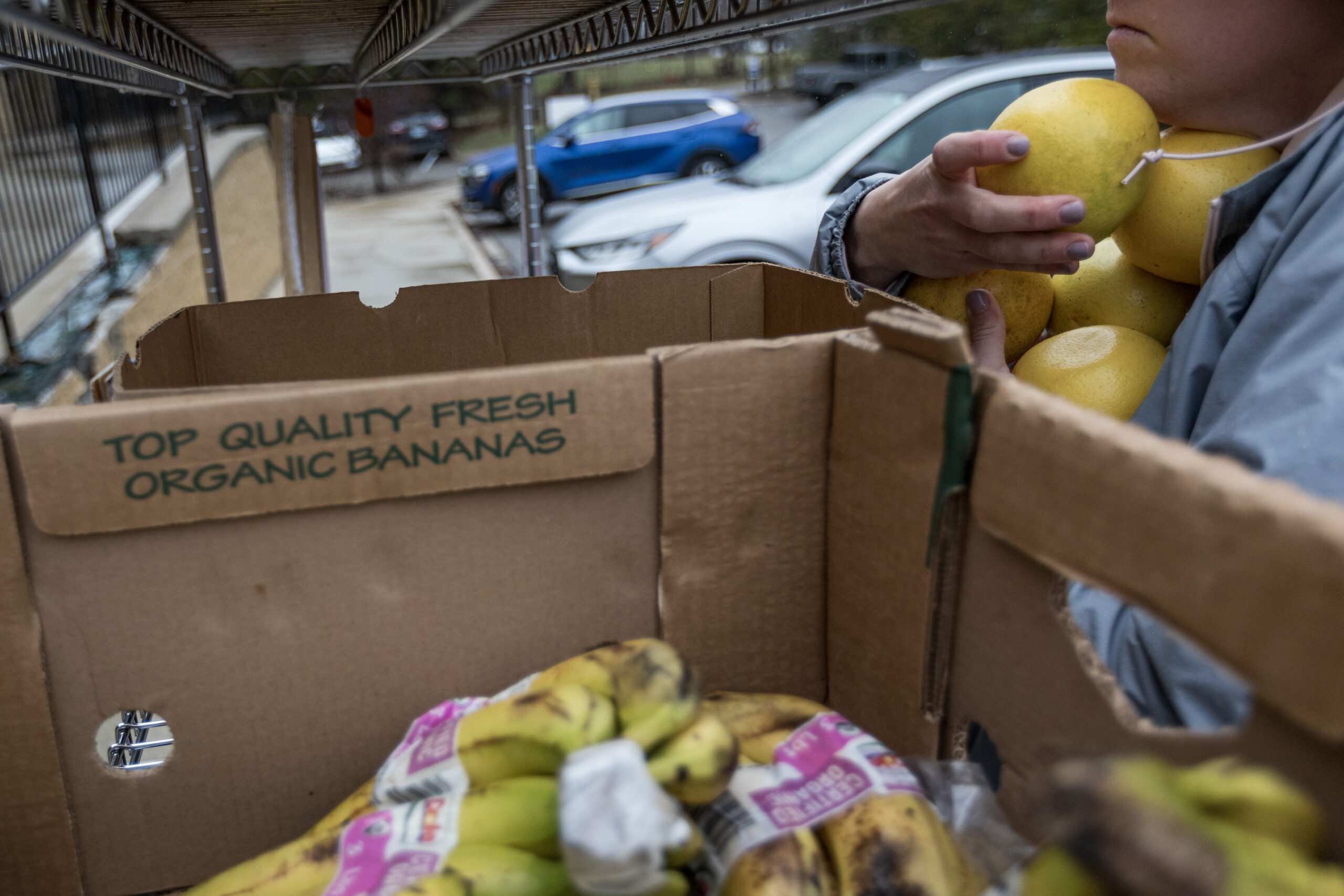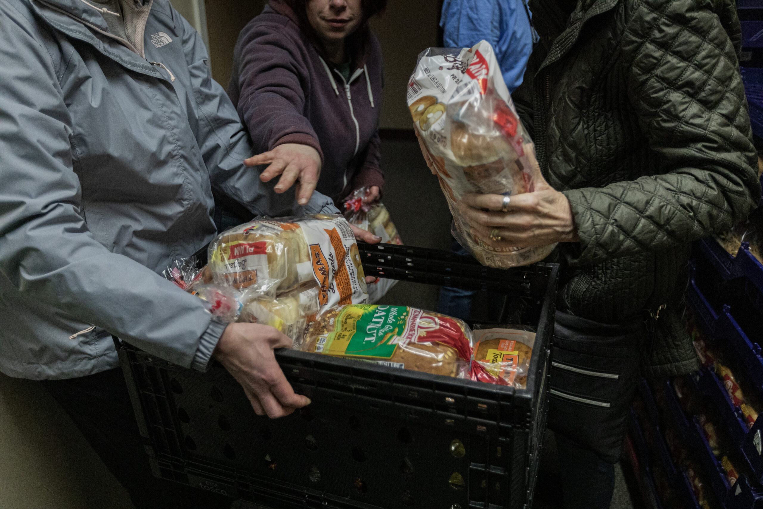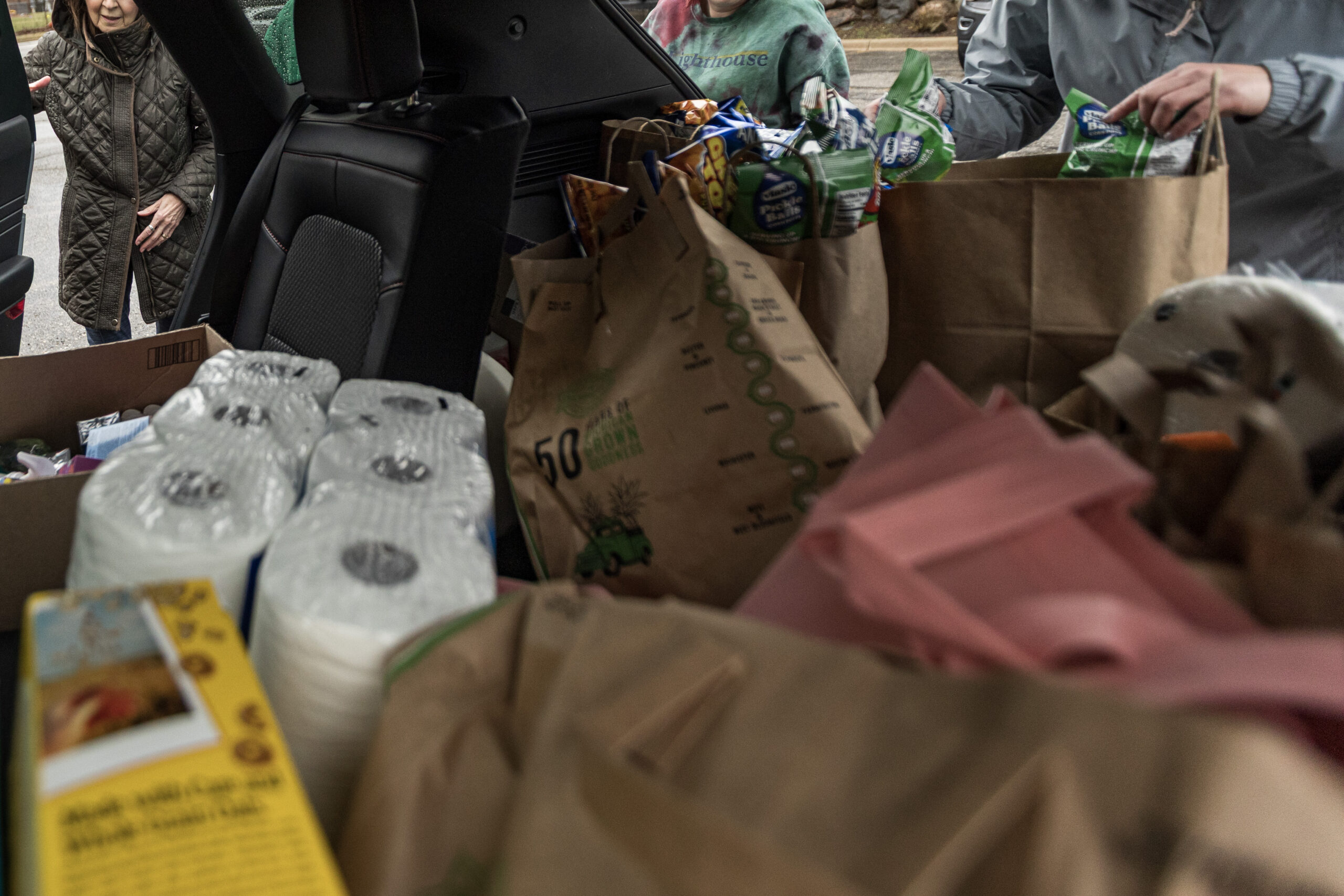 Afuera del banco de alimentos, se reúne con otros dos voluntarios que llegan en sus autos. Empiezan a dividir los productos que Helterhoff llevó. Después de sacar un carrito lleno de artículos del centro de recursos, seleccionan y acomodan todo en sus vehículos. Hoy hay suficiente comida, y se entregará a ocho familias.