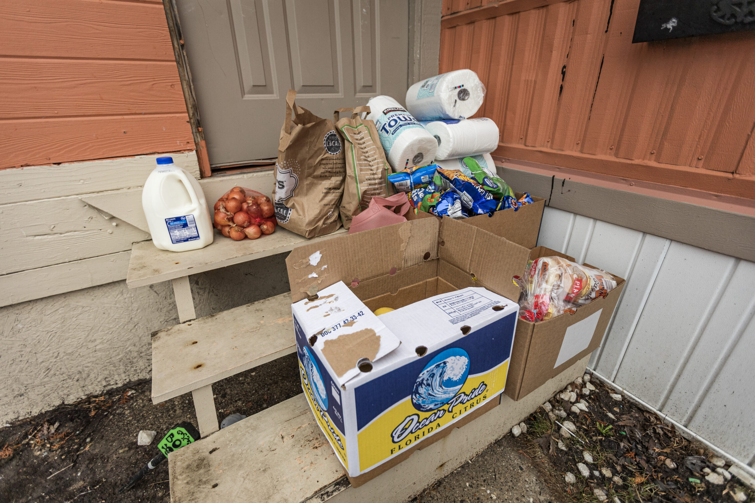 Las entregas en estas áreas se hacen sin contacto. Se cuenta el número de bolsas por familia, ya que algunas casas albergan a más de un grupo. Las bolsas y cajas se dejan en la puerta, en las escaleras o en el porche, según corresponda, y se envía un mensaje avisando que la despensa ya llegó y que el área está libre. Luego el carro arranca y el proceso se repite.