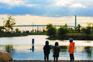 Key park features include a two-and-a-half-acre Huron-Clinton Metroparks Water Garden that provides much-needed coastal wetland habitat and an opportunity for park visitors to interact with nature, learn about conservation, and participate in environmental education. It is one of the few places along the Detroit River, along with Belle Isle, where kids and families can touch and feel the water. This water garden is a form of wetlands, often called “nurseries of life” because they support thousands of species. The Detroit River has lost 97% of its coastal wetlands to commercial and industrial development, so Wilson Park represents a net gain in these rare habitats.