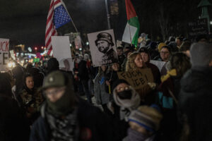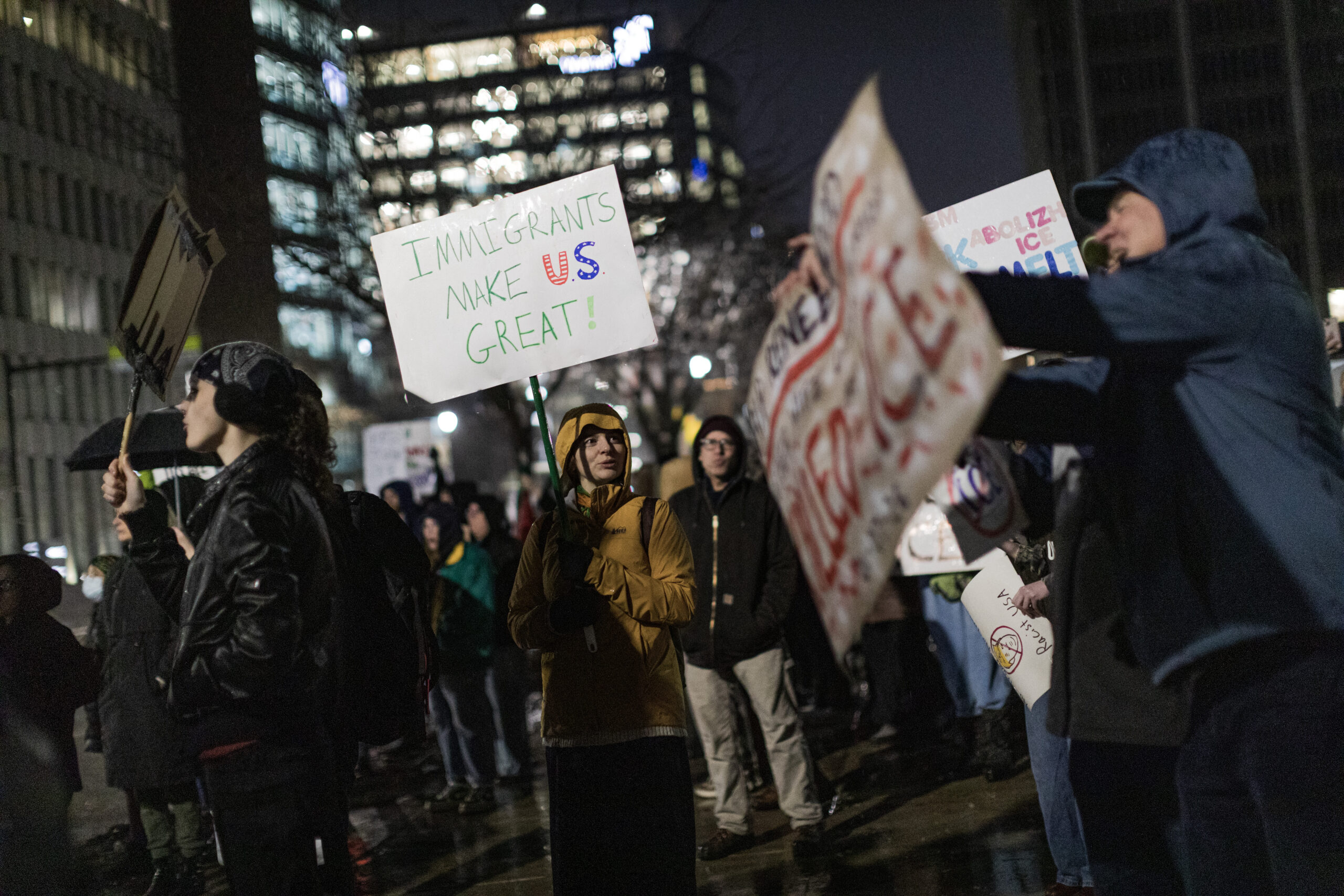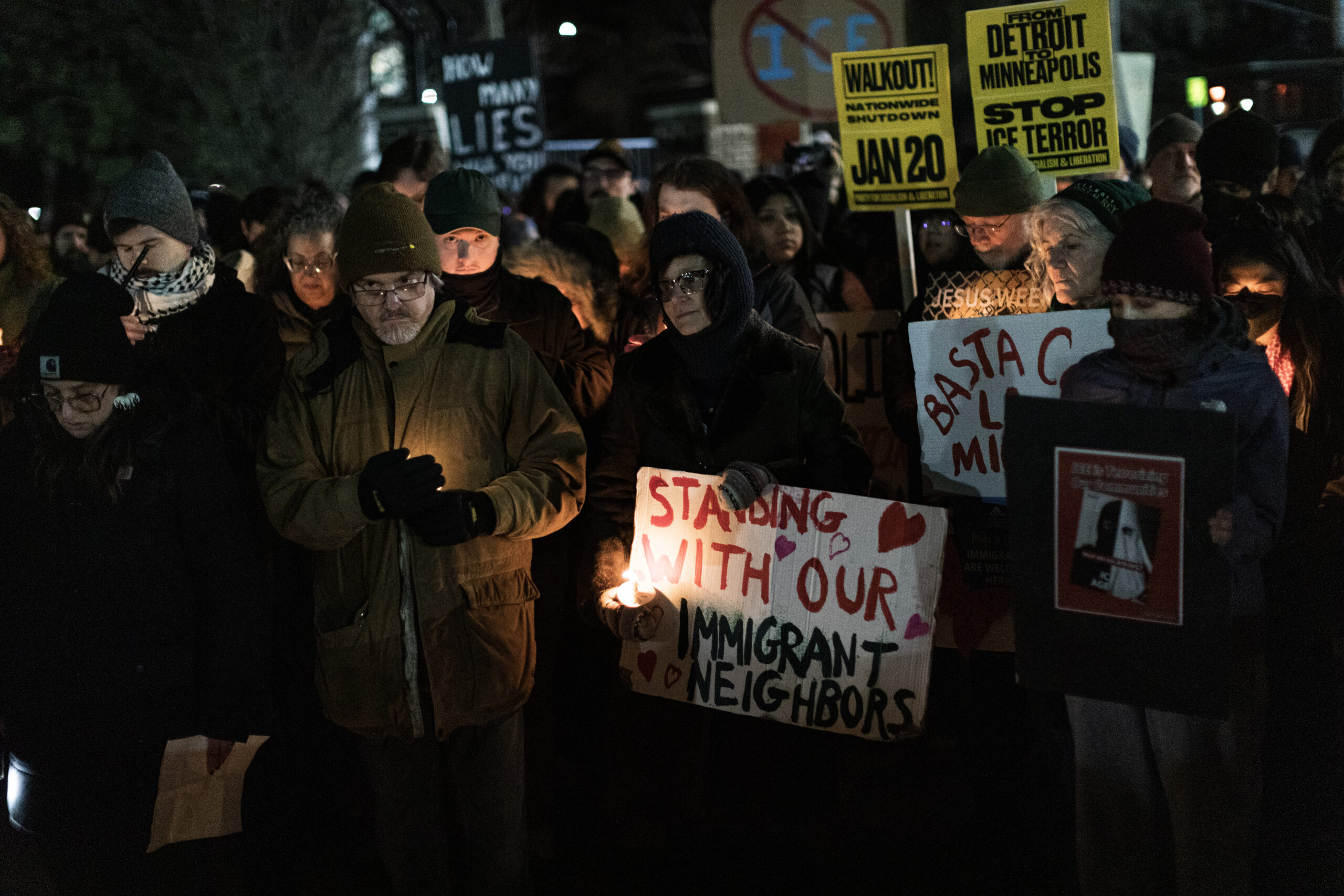 La noche del jueves 8 de enero, el cielo nublado y una ligera llovizna presagiaban una fuerte lluvia en el oeste de Michigan. Para cuando empezó a llover, alrededor de doscientas personas habían ido llegando de a pocos a la Plaza Calder, en el centro de Grand Rapids. Algunas tenían el rostro cubierto, otras sostenían velas y levantaban pancartas; todas proclamaban el mismo mensaje: “ICE fuera de nuestras calles”.