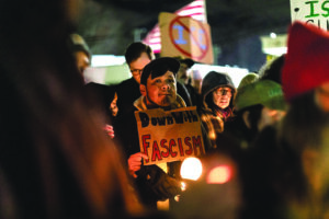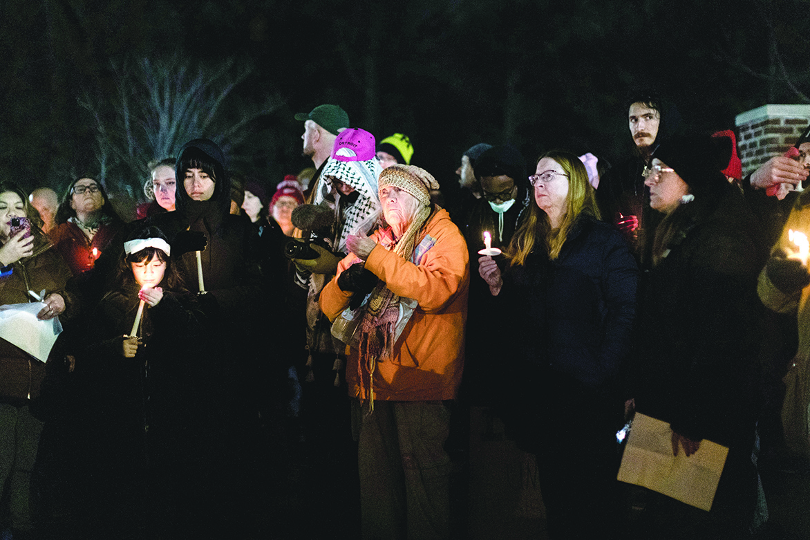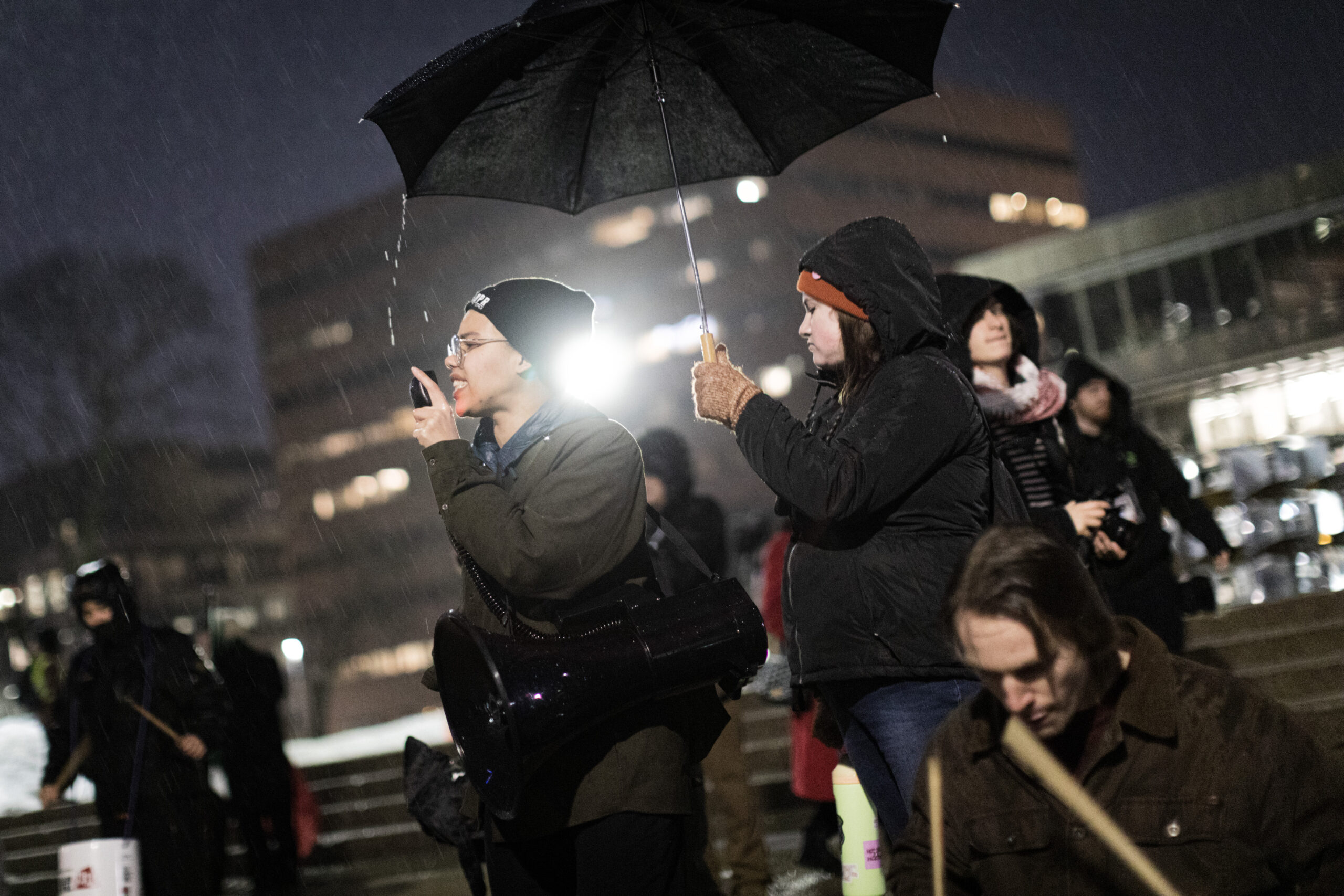 On Thursday evening, January 8, a cloudy sky and light raindrops foreshadowed the heavy rain that would whip across west Michigan that night. Around two hundred people had slowly filled Calder Plaza in downtown Grand Rapids when the rain began. Some had their faces covered, some held candles, and signs were held aloft, all together proclaiming the same message: ICE off our streets.