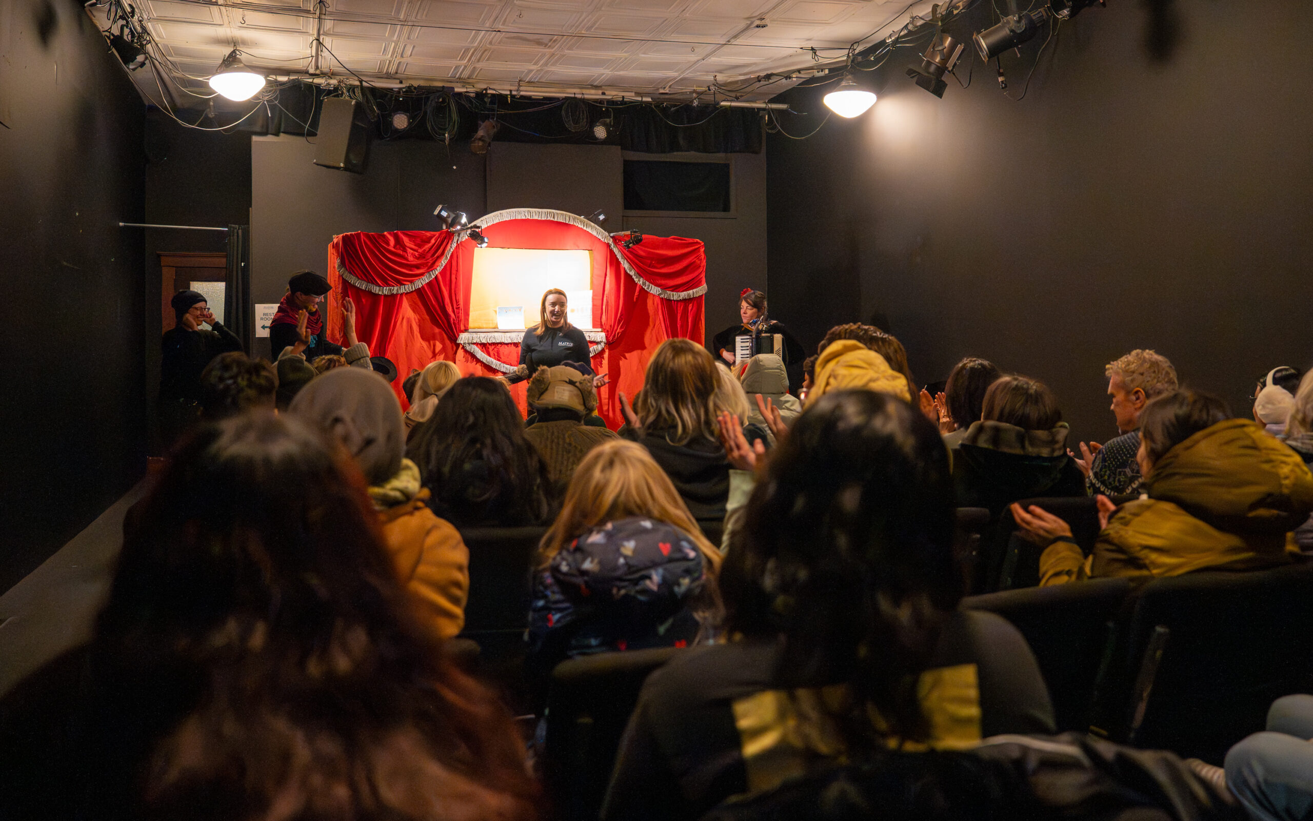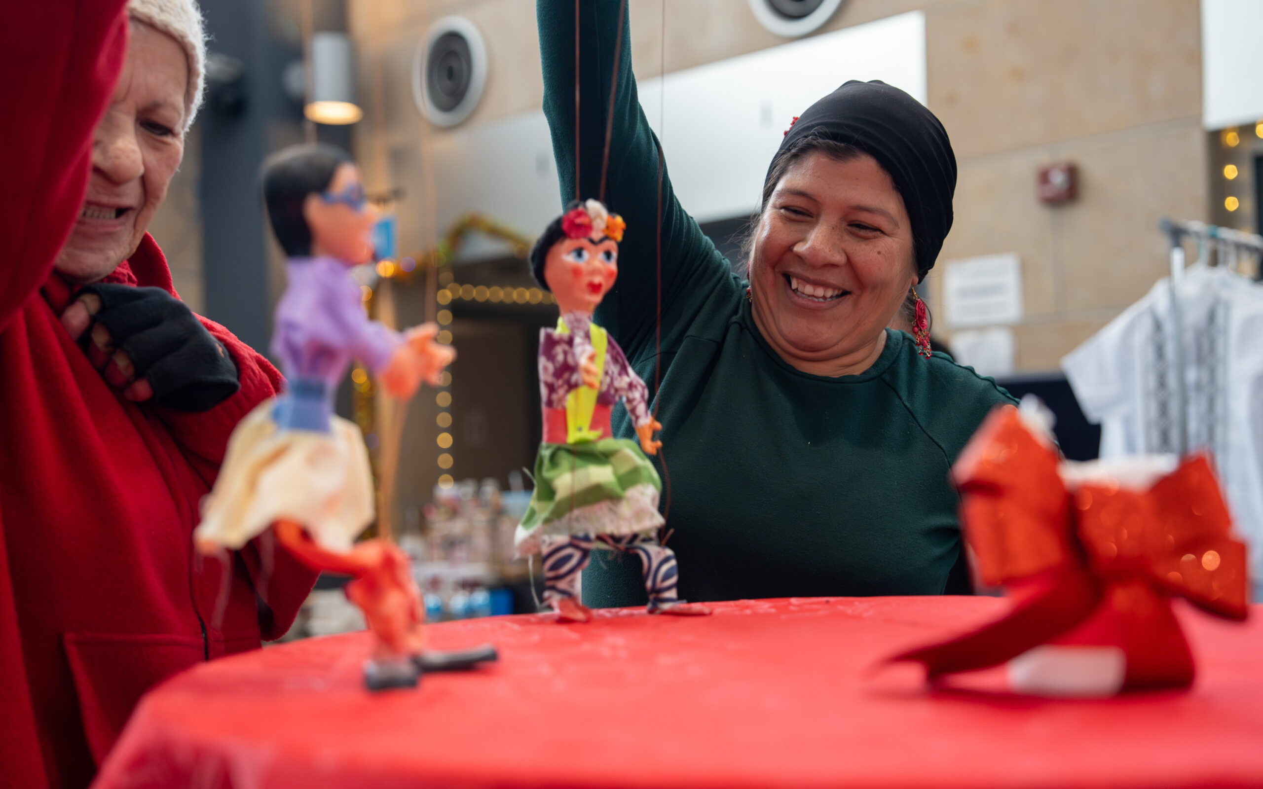 La Plaza del Sol estaba repleta de familias decorando galletas navideñas, bebiendo ponche navideño y visitando a Pancho Claus. El Teatro Matrix presentó funciones con aforo completo del espectáculo de marionetas “There’s Snow Business like Snow Business” del Flying Cardboard Theatre, y también abrió el escenario para que el público contara historias de desastres navideños relacionados con la nieve y viera al grupo de teatro Matrix Playback Theatre Troupe recrear la avería de un coche, la rotura de una tubería de agua y conocer por primera vez a una familia en medio del caos.