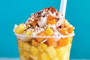 Place the fruit in a baking dish, stir in a bowl, and serve in individual glasses like a fruit cocktail. Garnish with orange juice, lime juice, salt, chili, and Cotija cheese.