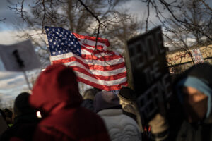 Shortly after the demonstration began, a small group of counter-protesters, carrying a large sign that read “America stands with ICE,” quickly approached and tried to reach the center of the protest, shouting their support for ICE, which incited the main group of demonstrators. Among the counter-protesters were Jayden Scott and Gregor Butzow, both Michiganders, who have been disrupting anti-ICE protests, including in Minnesota, by speaking out against immigrants and Muslims and supporting ICE’s actions.