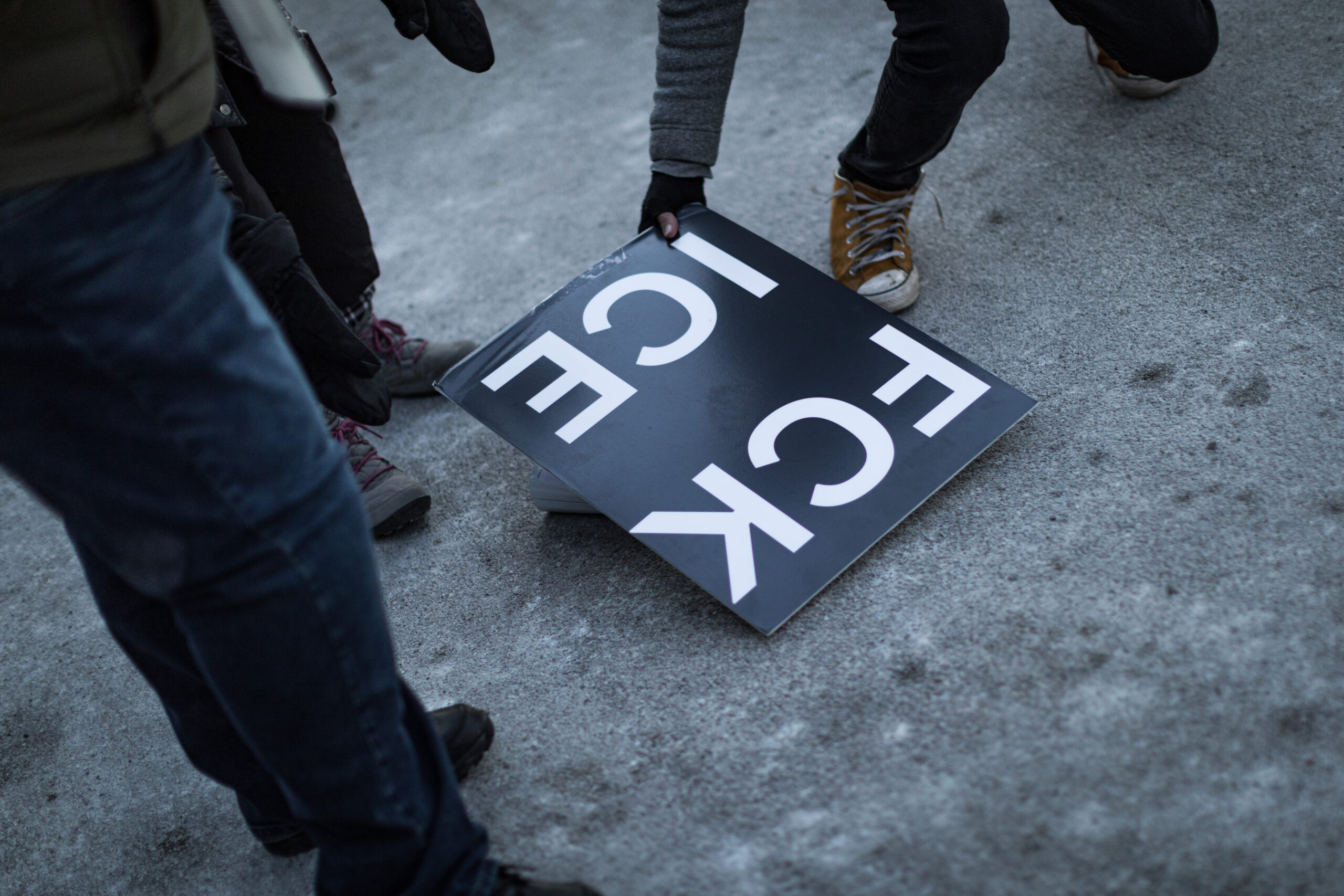Poco después de iniciada la manifestación, un pequeño grupo de contramanifestantes intentó abrirse paso entre gritos al centro de la protesta con un gran cartel que decía “America stands with ICE”, lo que encendió los ánimos del grupo principal. Entre los contramanifestantes se encontraban Jayden Scott y Gregor Butzow, ambos de Michigan, quienes han interrumpido protestas anti-ICE, incluso en Minnesota, expresándose contra inmigrantes y musulmanes y apoyando las acciones de ICE.