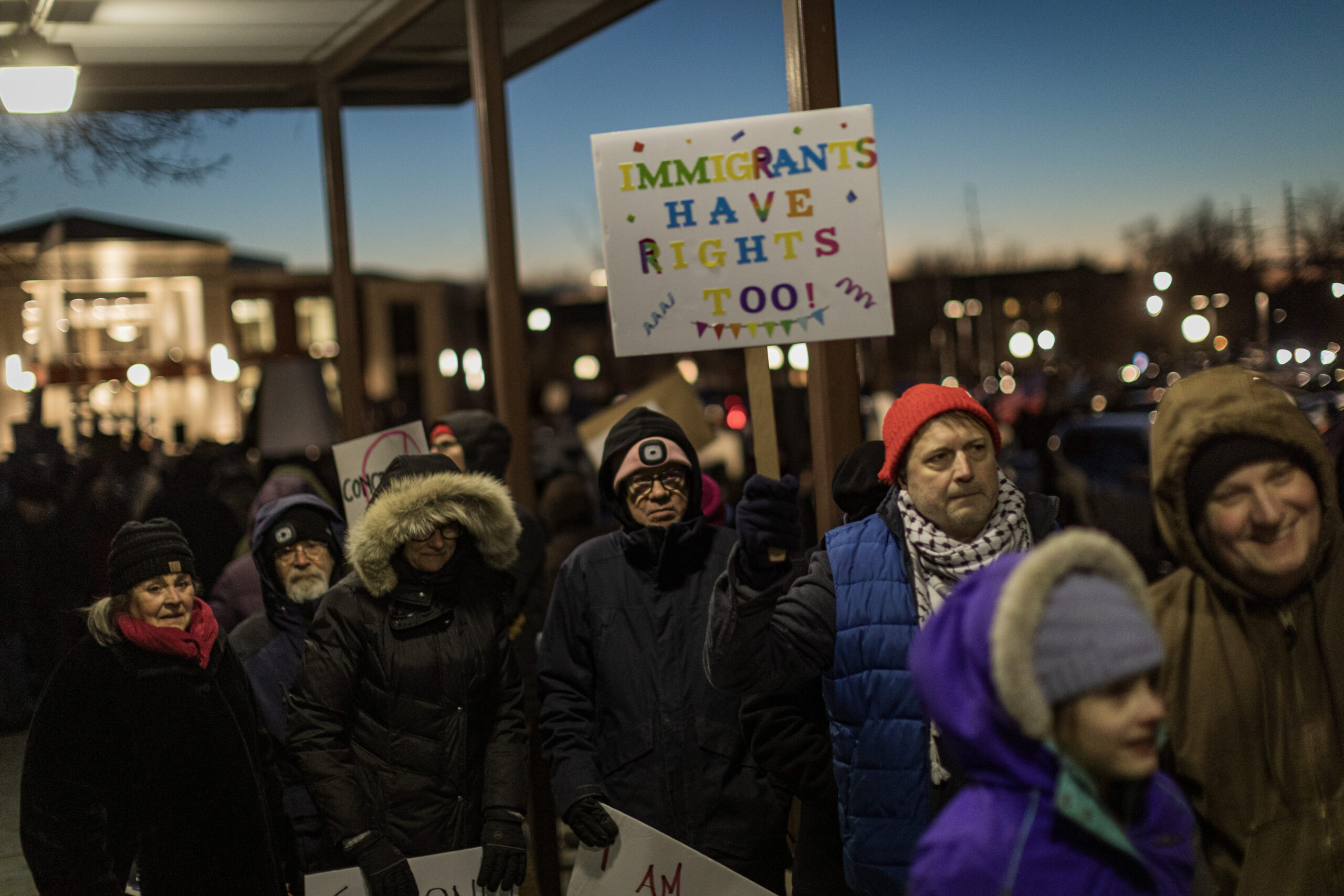 El centenar de gente se citó al anochecer del 23 de febrero, horas antes de la reunión del Concejo Municipal, para protestar por la nueva adquisición de ICE dentro de los límites de la pequeña ciudad: un almacén de 261,450 pies cuadrados en el 7525 de Cogswell Street destinado a albergar hasta 500 inmigrantes para procesamiento o deportación.