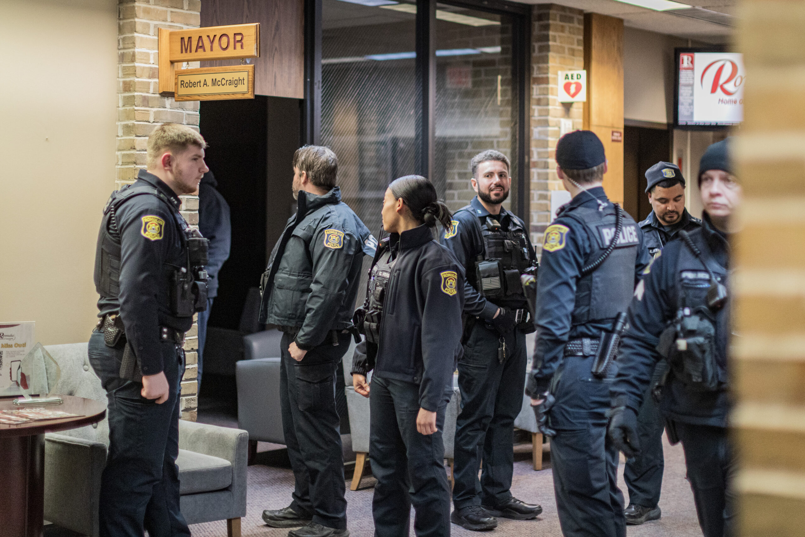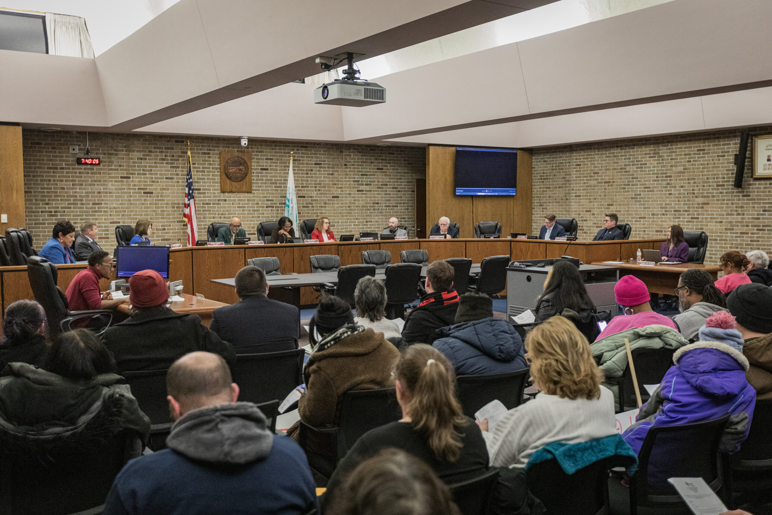 Más tarde, teniendo el ayuntamiento lleno a su máxima capacidad, los funcionarios locales aprobaron por unanimidad una resolución que se opone formalmente a la instalación del nuevo centro de detención de ICE dentro de los límites de la ciudad. La reunión comenzó a las 7:30 p.m., y afuera decenas de manifestantes se agolpaban en la entrada, continuando con gritos y golpes en las ventanas para intentar conseguir un asiento. Entre gritos de “¡Déjennos entrar!”, al menos una docena de oficiales de la policía de Romulus custodiaban el interior del edificio.