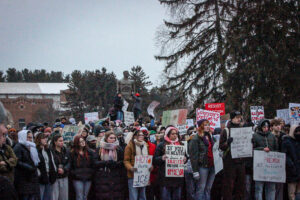 Hundreds of students began marching on Thursday afternoon, January 29, at Michigan State University in East Lansing, protesting immigration policies as they made their way to the statue of Sparty, where the crowd spilled over onto the road. The steam rising from their chants reflected the freezing 13 °F shown on the thermometer, and the signs—shaken by thick gloves warming their hands—once again declared, “No one is illegal in stolen land.”