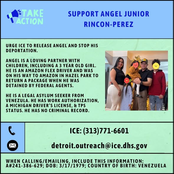 “Estamos instando a U.S. Immigration and Customs Enforcement (ICE) a liberar a Edwin Vladimir Romero Gutierrez y Angel Junior Rincón-Pérez, dos hombres que cuentan con autorización de trabajo y estatus de Protección Temporal (TPS) y que están solicitando asilo legal en Estados Unidos”, comienza la carta enviada el 6 de febrero por las senadoras Stephanie Chang y Mary Cavanagh, la representante Verónica Paiz y la concejala de Detroit Gabriela Santiago-Romero a Kevin Raycraft, director de campo de ICE en Detroit.