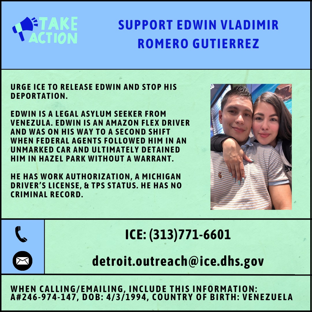 “We are urging U.S. Immigration and Customs Enforcement (ICE) to release Edwin Vladimir Romero Gutierrez and Angel Junior Rincon-Perez, two men who have work authorization and Temporary Protected Status (TPS) status and are seeking legal asylum in the United States,” begins the letter sent on February 6 by Senators Stephanie Chang and Mary Cavanagh, Representative Verónica Paiz, and Detroit Councilwoman Gabriela Santiago-Romero to Kevin Raycraft, ICE Detroit Field Director.