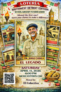 More than $2,000 was raised at the March 11th event, and combined with other alumni efforts, the scholarship fund now stands at more than $21,000. When asked about the success of the evening, Laura Chavez stated, “This wasn’t just a fundraiser—it was a reflection of who we are. It took nonprofits, community ambassadors, small businesses, and alumni all coming together to make this possible. Every card, every story represents the people and places that raised us and through Raíces Detroit we’re honoring that legacy while creating real opportunities for the next generation.” The next Lotería Southwest Detroit Edition fundraiser benefiting the Dr. Jorge L. Chinea Scholarship is scheduled for Saturday, April 11th at 6 p.m. at Mexicantown Community Development Corporation’s Plaza del Norte and Chavez welcomes community members to join in the fun and support the cause. See details below.